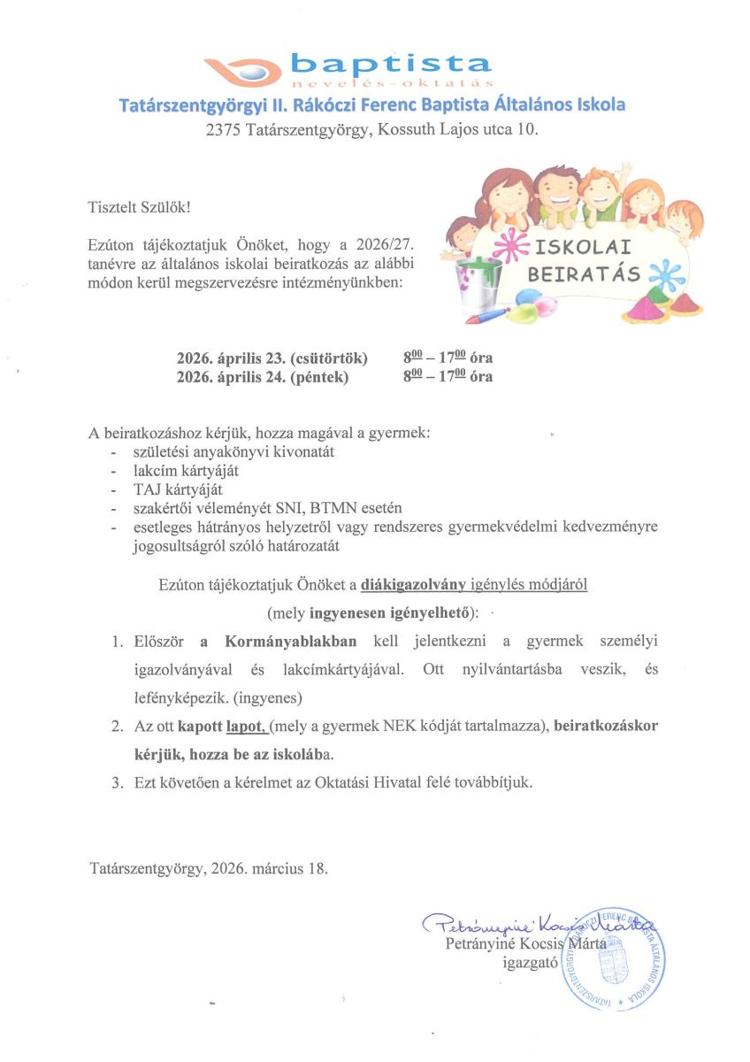 2. Az ott kapott lapot, (mely a gyermek NEK kódját tartalmazza), beiratkozáskor kérjük, hozza be az iskolába.